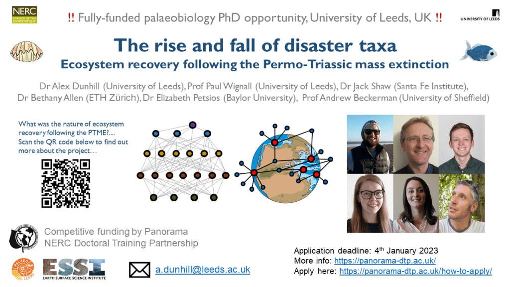 Come and join the lab at Palaeo@Leeds and do a fully-funded NERC Panorama DTP PhD with me on the ecological recovery from the Permian-Triassic mass extinction!