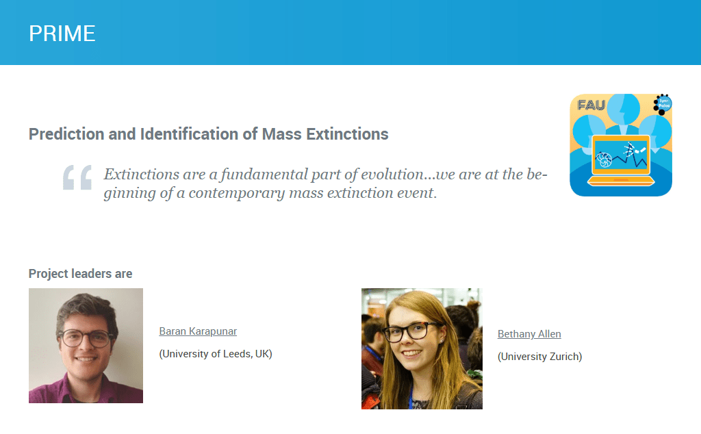 Congratulations to lab member Baran Karapunar and former lab member Bethany Allen (now at ETH Zurich) for getting there Paleosynthesis workshop PRIME – Prediction and Identification of Mass Extinctions – workshop funded.