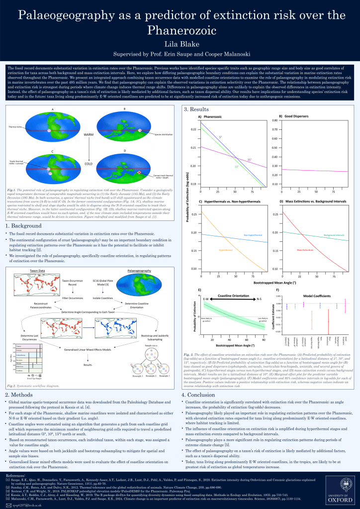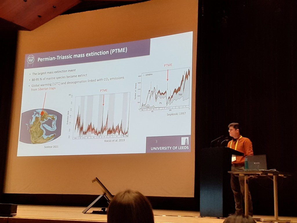The DeepBio@Leeds PGRs presented a number of extinction-themed posters, including Amy Shipley‘s on extinction drivers of a marine megafaunal extinction; Annabel Nicholl‘s on ecosystem recovery following the Permo-Triassic mass extinction; Lila Blake‘s on palaeogeography as a predictor of extinction risk over the Phanerozoic; and Lilian Perez-Sosa (external PGR at CIMAT, Mexico) on modelling extinction rates in the Phanerozoic across 500 year intervals.